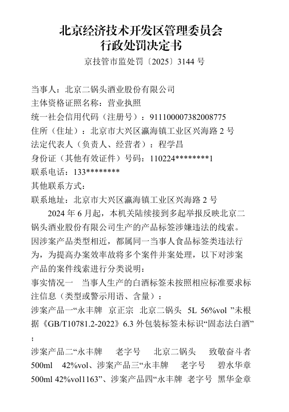 按照行政惩罚决定书,二锅头存正在食物标签未标注“固态法白酒”、食物标签未标注警示语、食物标签不合适施行尺度要求、食物外包拆盒未标注出产日期等问题。此外,决定书显示,涉案产物的检测演讲证明产物无质量问题。二锅头酒业股份无限公司成立于2002年8月,始建于1949年10月国营大兴酒厂的改制企业。目前二锅头酒业股份无限公司具有永丰二锅头、行销全国二十多个省、自治区、曲辖市。2011年5月,“永丰”牌被商务部评为中华老字号,并于2023年通过复核。